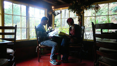 After a really good and cosy sleep in our lovely wooden cabin (called Grandpa's Room) at Deetjen's Big Sur Inn, it was champagne in bed and up early for another mega breakfast.